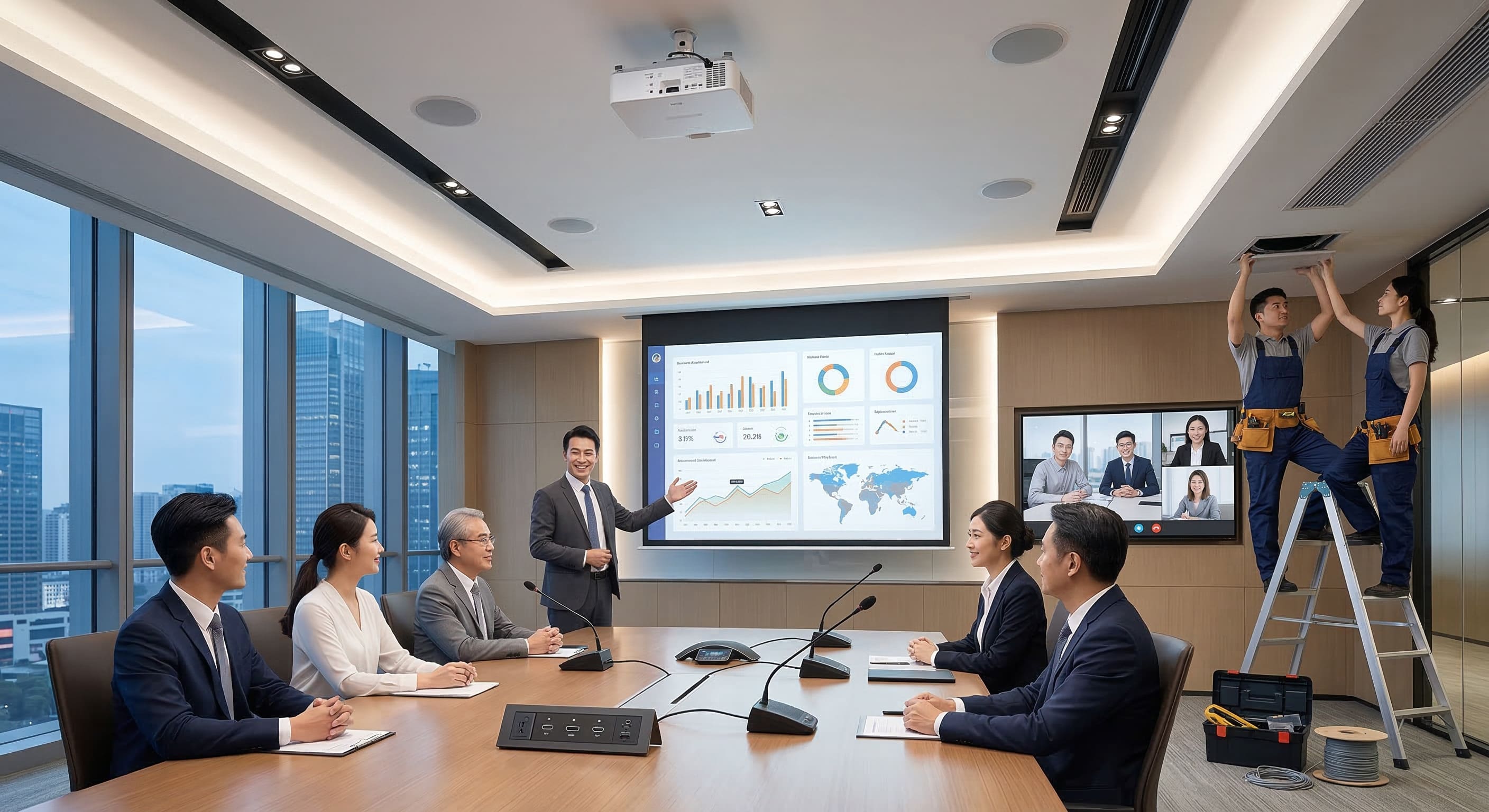 在混合辦公與全球化供應鏈交織的現代商業環境中,會議室早已不再只是擺放長桌與白板的實體空間,而是企業與跨國客戶、遠端研發團隊進行高頻率決策的核心樞紐。許多企業主與福委會投入大量資源裝潢氣派的會議室,卻在關鍵的視訊會議中遭遇嚴重的技術干擾:畫面發白模糊導致簡報數據無法辨識、麥克風收音充滿空谷回音與雜訊,甚至連投影機的連線都頻頻中斷。